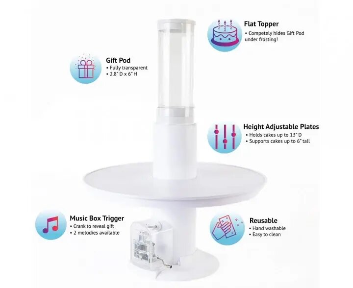 Check out the surprise cake stand that pops out a secret gift from the center of the cake in action via the video below.