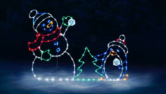 ⛄This brightly lit snowman and penguins will have endless snowball fights.Providing passersby with the animated illusion of two friends tossing snowballs back and forth, the pre-lit display is illuminated with 195 LEDs—rated for 8,000 hours of use.AC adapter with 59″ long cord. Assembly required. 42″ H x 62 1/2″ W x 1″ D. (4 lbs.)