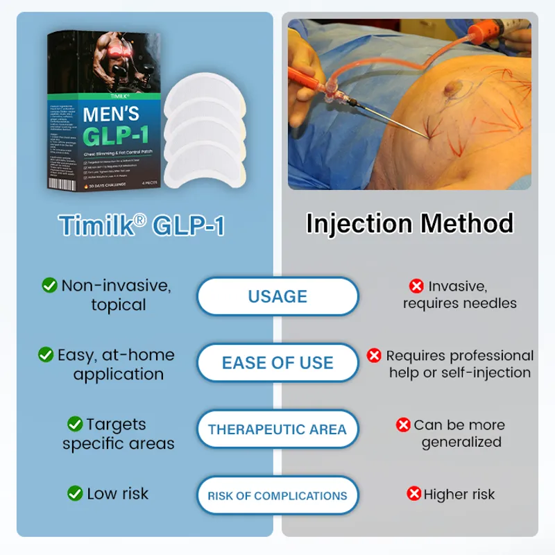 Choosing the Timilk® Men’s GLP-1 Chest Fat Control Patch offers a convenient, non-invasive, and cost-effective solution for reducing chest fat. Unlike injections, which require professional assistance, cause discomfort, and can result in higher costs and potential side effects, our patch is simple to use at home with minimal risk. It targets specific areas gradually, ensuring a smooth and consistent effect without the pain or complications associated with needle-based treatments. With Timilk®, you can achieve a firmer, healthier chest contour with ease, comfort, and confidence.