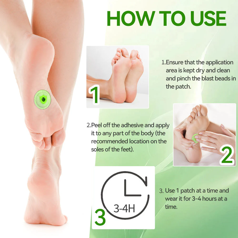 - Peel off the adhesive and apply it to any part of the body (the recommended location on the soles of the feet).