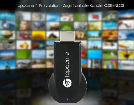 So sieht die Topacme™ TV Evolution Box aus. Es handelt sich um eine kleine Box, die in den HDMI-Anschluss Ihres Fernsehers eingesteckt wird. Der Vorteil ist, dass alle Fernseher auf der Welt seit 2003 mit einem HDMI-Anschluss ausgestattet sind, so dass ihn fast jeder nutzen kann.