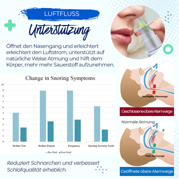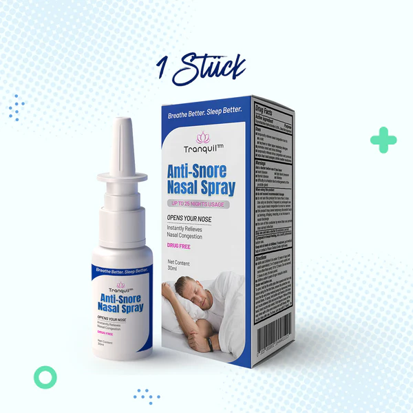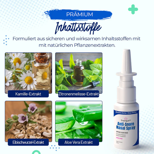 Introducing Tranquil™ Anti-Schnarch-Nasenspray, a groundbreaking solution designed to specifically target the key areas contributing to snoring. By addressing the nasal passages, soft palate, uvula, tonsils, adenoids, and pharyngeal muscles, this innovative spray offers a comprehensive approach to resolving the problem of snoring. With its carefully formulated natural ingredients, including aloe vera extract, chamomile extract, lemon balm extract, and marshmallow root extract, Tranquil™ works to reduce inflammation, open up airways, and alleviate anatomical obstructions, provides fast-acting relief and helps restore harmonious sleep for you and your loved ones.
