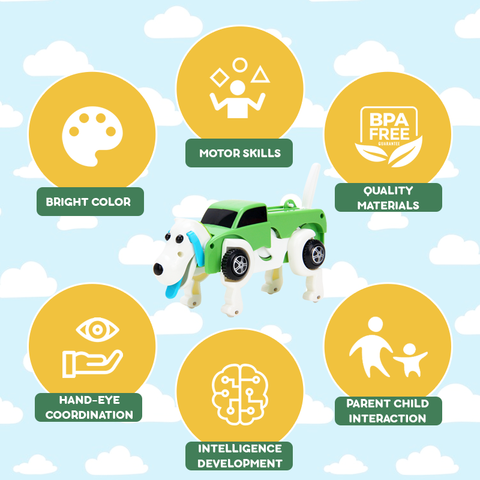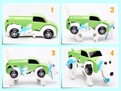 This transforming car will automatically convert from car to dog with just the winding of winder. Cute dog design and large enough to hold, bright colored and no small pieces to worry about.SAFE & DURABLE MATERIAL