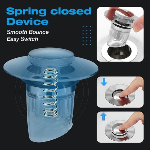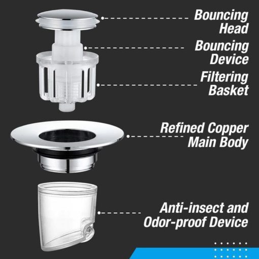TRIPLE BLOCKADE: The upgraded drain stopper not only has an anti-clogging basket filter, but also an anti-insect and odor-proof device. It can prevent clogging, collect jewelry, rings, dirt and other items, and can also prevent insects and odors and prevent water return.