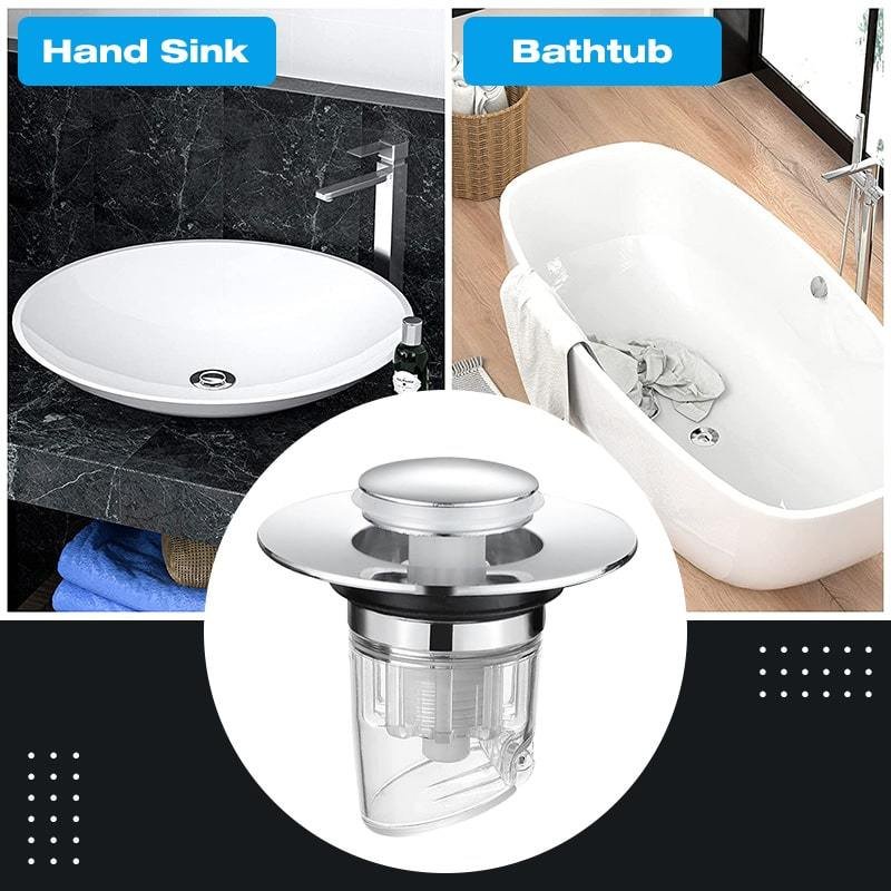 SPRING CLOSED DEVICE: Pop-up design overturns the traditional, inconvenient drain (e.g. basic plug with chain)! Just press the top cap down gently to switch 2 modes – stopper (to keep water) and strainer (to drain off water).
