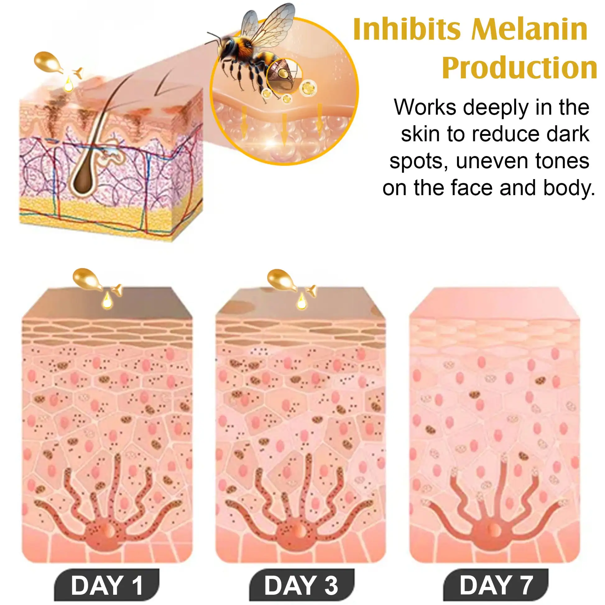 Bee Venom: works by inhibiting the production of melanin, the pigment responsible for skin coloration. By reducing melanin synthesis, kojic acid helps to fade dark spots, hyperpigmentation, and uneven skin tone, leading to a brighter and more even complexion.