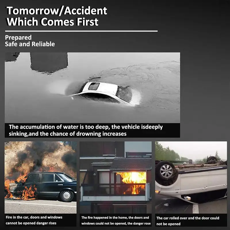 SEAT BELT CUTTER: The seat belt cutter features a built-in stainless steel cutter with a U-shaped hidden knife edge design, ensuring safety and preventing hand injuries. Simply align the U-shaped mouth of the cutter with the seat belt, push it forward swiftly, and get out of the vehicle easily and quickly.