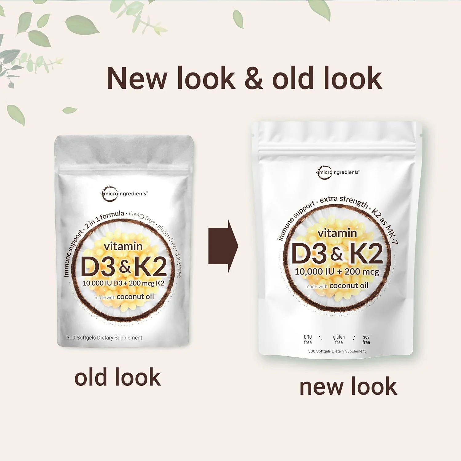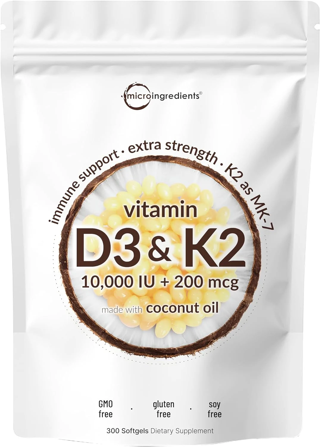 - Each pouch offers 300 easy to consume mini coconut oil infused softgels. A potent one a day complex that provides natural sunshine vitamin synergy. 10,000 iu Vitamin D3 and 200 mcg vitamin K2 per dose.