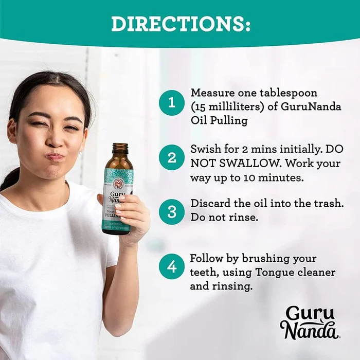 To start oil pulling take one tablespoon of the GuruNanda’s oil andswish it around your mouth for about 2-5 min (you can do up to 10min) make sure to move it between your teeth and around your gums.After swishing, spit the oil out into a trash can or tissue, as it can clogsinks or toilets, Rinse your mouth thoroughly with water and follow upwith regular brushing and flossing.
